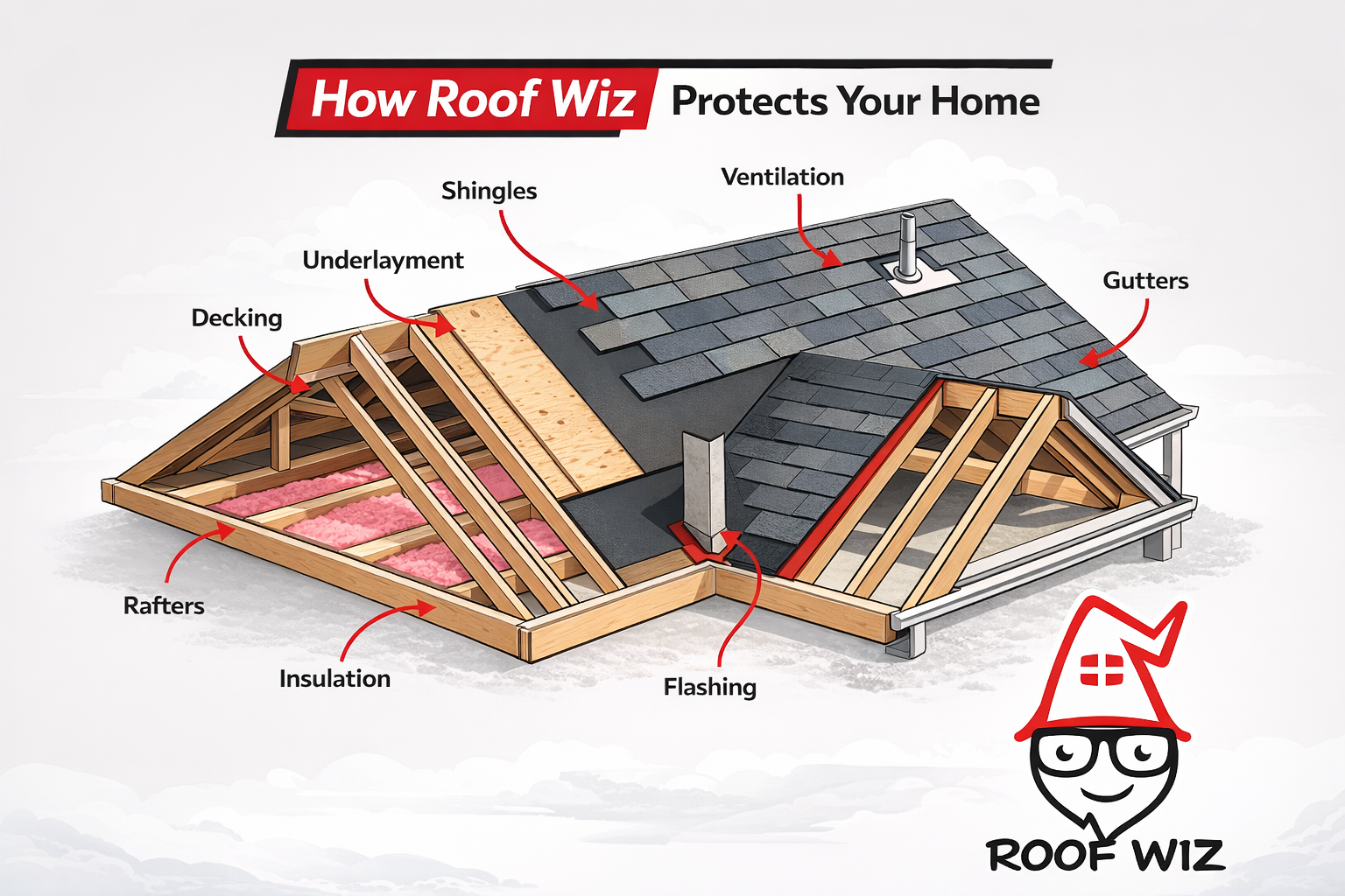 Your roof does more than keep out rain and snow—it protects your home and family every day. But do you know what makes up your roof? Understanding the parts of a roof helps spot trouble early and keeps your home safe through Michigan’s harsh winters and Indiana’s storms. Let’s break down roof anatomy in clear terms, so you know when to call Roof Wiz for a free inspection or repair estimate.